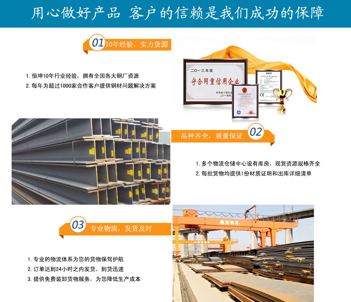 蘭州恒坤商貿(mào)有限公司立足于鋼材貿(mào)易,主要經(jīng)營:鋼板、角鋼、工字鋼、槽鋼、H型鋼、鍍鋅槽鋼、鍍鋅角鋼、鍍鋅板、鍍鋅卷、鍍鋅圓鋼、鍍鋅工字鋼多種型號(hào)鋼材產(chǎn)品。多年來,我公司始終堅(jiān)持質(zhì)量第一,信譽(yù)至上的經(jīng)營方針,與酒鋼、包鋼、八鋼、唐鋼、鞍鋼、萊鋼、兗礦、日照鋼鐵、濟(jì)鋼,成都、天津等多家企業(yè)達(dá)成大批量物資供應(yīng)協(xié)議,并且與省內(nèi)外多家客戶建立了合作關(guān)系。